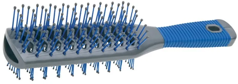 Щетка туннельная DEWAL из серии ЩЕТКИ ДЛЯ УКЛАДКИ: - Пластиковый штифт, 9 рядов; - Удобная, прорезиненная ручка, которая препятствует выскальзыванию расчески из ладони во время ее использования; - С двух сторон - длинные зубцы щетки предназначены для расчесывания прядей, а короткие - для моделирования укладки; - Сушка становится быстрой и легкой. Высококачественный пластик, Цвет синий