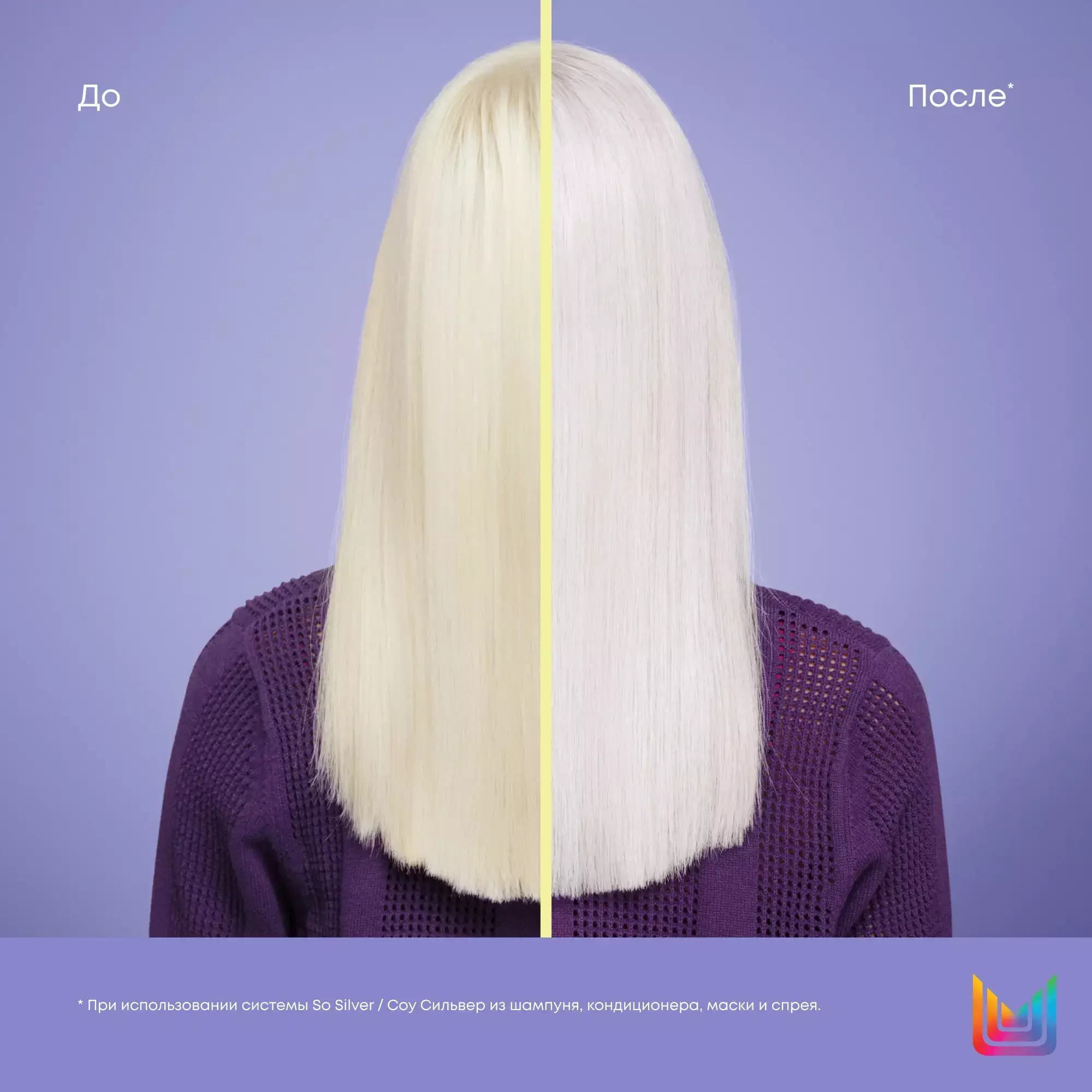 Кондиционер с фиолетовыми пигментами So Silver Purple эффективно устраняет медный оттенок волос уже после первого применения, придаёт волосам блеск, делает их более сильными и увлажнёнными. Откалиброванные красители в составе кондиционера помогают нейтрализовать медно-жёлтый оттенок, обеспечивая долговременный результат.