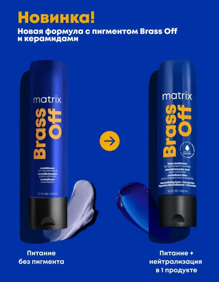Синий оттеночный кондиционер (бальзам) для окрашенных волос Матрикс Брасс Офф удаляет медные, светло-оранжевые и рыжие оттенки с темного блонда 5–7 уровней тона. Представляет собой пигментированный кондиционер, обеспечивающий тонирование и уход за одно применение. Средство увлажняет волосы и делает их более блестящими и сильными.