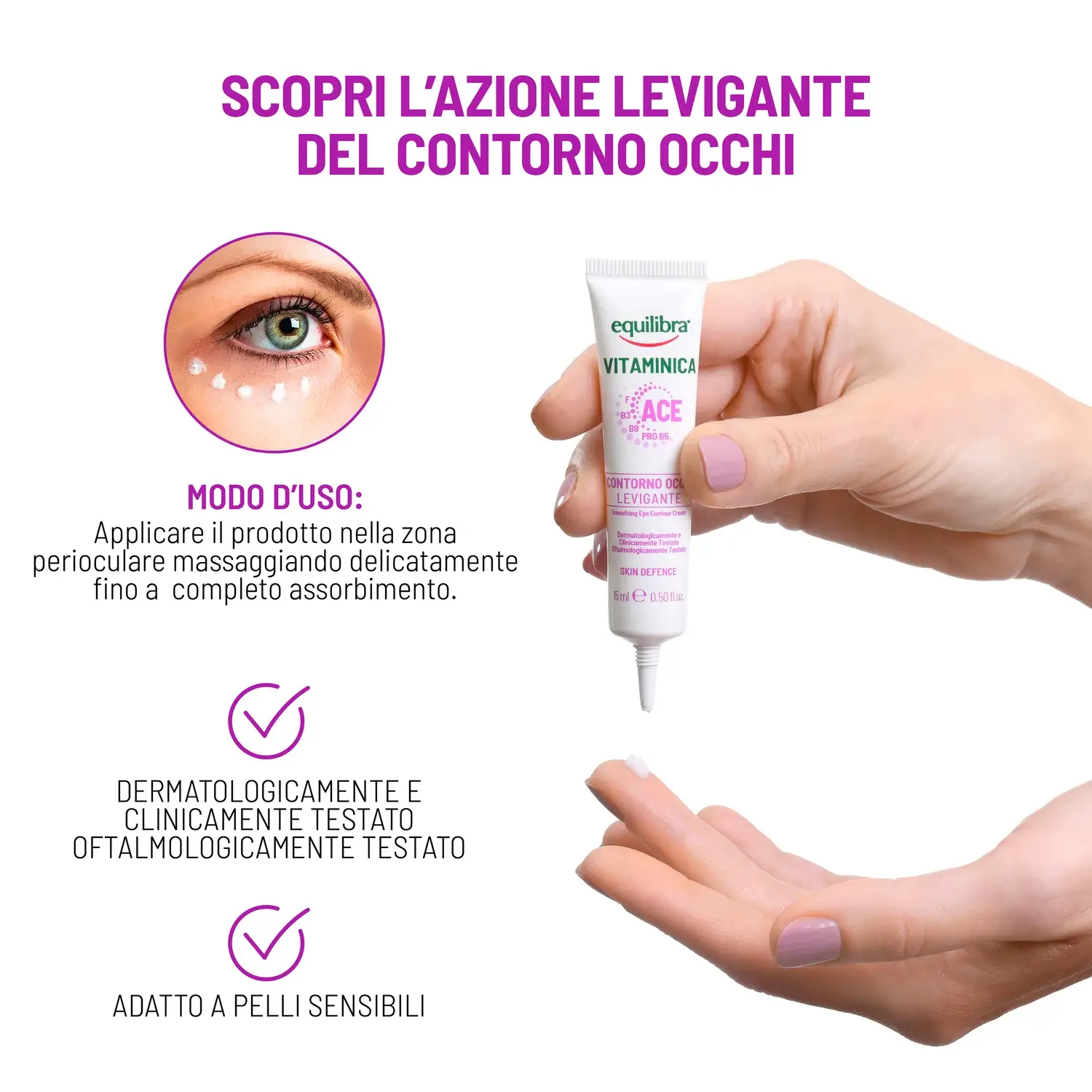 Equilibra ® Vitaminica Smoothing Eye Contour — это нежная эмульсия, предназначенная для ухода за кожей вокруг глаз, которая быстро впитывается, не утяжеляя ее.