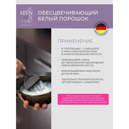 1. Смешайте необходимое количество осветляющего порошка KEEN BLEACHING POWDER WHITE/BLUE с крем-окислителем KEEN в неметаллической емкости.