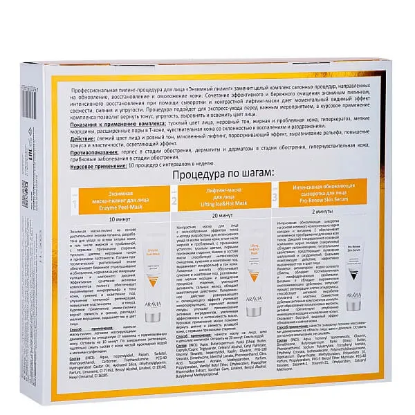 Профессиональная пилинг-процедура для лица «Энзимный пилинг» заменит целый комплекс салонных процедур, направленных на обновление, восстановление и омоложение кожи. Сочетание эффективного и бережного очищения энзимным пилингом, интенсивного восстановления при помощи сыворотки и контрастной лифтинг-маски дает моментальный видимый эффект свежести, сияния и упругости. Процедура подойдет для экспресс-ухода перед важным мероприятием, а курсовое применение комплекса позволит вернуть тонус, упругость, выровнять и освежить цвет лица.