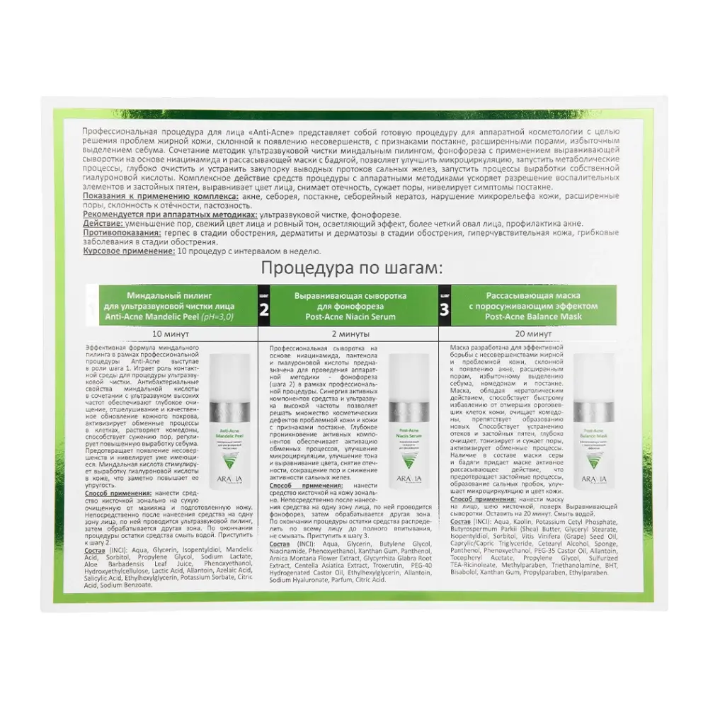 Профессиональная процедура для лица «Anti-Acne» для решения проблем жирной кожи, склонной к появлению несовершенств, с признаками постакне, расширенными порами, избыточным выделением себума, позволяет улучшить микроциркуляцию, запустить метаболические процессы, глубоко очистить и устранить закупорку выводных протоков сальных желез, запустить процессы выработки собственной гиалуроновой кислоты. Комплексное действие средств процедуры с аппаратными методиками ускоряет разрешение воспалительных элементов и застойных пятен, выравнивает цвет лица, снимает отечность, сужает поры, нивелирует симптомы постакне.