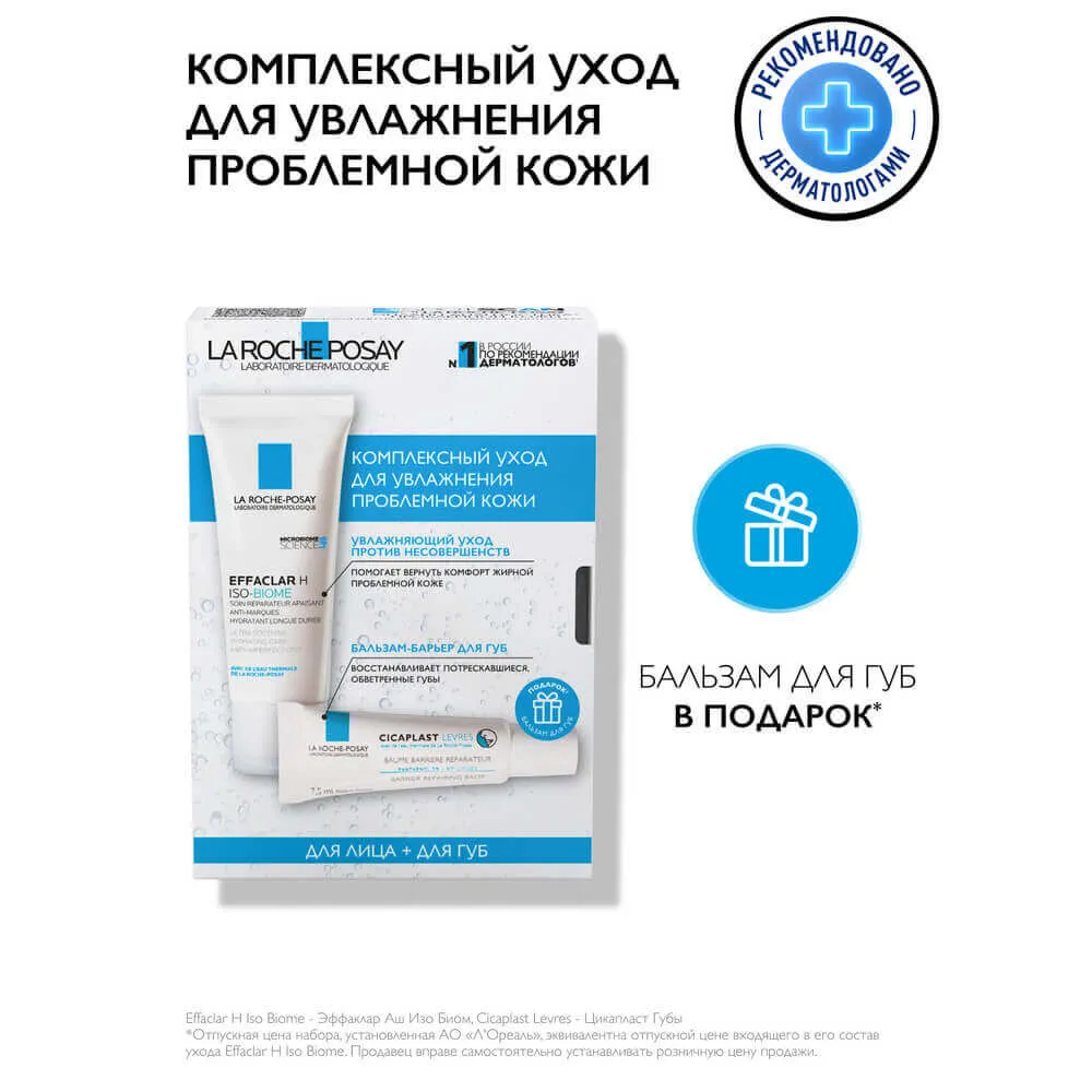 1. EFFACLAR Н Iso-Biome УЛЬТРА Успокаивающий Восстанавливающий Уход против несовершенств, 40 мл. Наносить утром и вечером на отчищенную кожу. 2. CICAPLAST LEVRES Восстанавливающий бальзам-барьер для губ, 7,5 мл. Наносить на кожу губ по мере необходимости. Средство может использоваться как основа для макияжа губ.