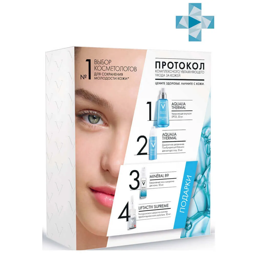 1. AQUALIA THERMAL, УВЛАЖНЯЮЩАЯ ЭМУЛЬСИЯ SPF25, 50 МЛ: AQUA / WATER; GLYCERIN; OCTOCRYLENE; HOMOSALATE; ETHYLHEXYL SALICYLATE; SILICA; BUTYL METHOXYDIBENZOYLMETHANE; DIMETHICONE; NIACINAMIDE; PEG-100 STEARATE; GLYCERYL STEARATE; MANNOSE; STEARIC ACID; CERAMIDE NP; DIMETHICONE/VINYL DIMETHICONE CROSSPOLYMER; SODIUM HYDROXIDE; SODIUM PCA; MYRISTIC ACID; PALMITIC ACID; AMMONIUM POLYACRYLOYLDIMETHYL TAURATE; TOCOPHEROL; CAPRYLOYL GLYCINE; CAPRYLYL GLYCOL; TRISODIUM ETHYLENEDIAMINE DISUCCINATE; XANTHAN GUM; CETYLALCOHOL; PARFUM / FRAGRANCE. 2. AQUALIA THERMAL ДИНАМИЧНОЕ УВЛАЖНЕНИЕ. ПРОБУЖДАЮЩИЙ БАЛЬЗАМ ДЛЯ КОНТУРА ГЛАЗ, 15 МЛ: AQUA/WATER; GLYCERIN; DIMETHICONE; PROPANEDIOL; DIMETHICONE/PEG-10/15 CROSSPOLYMER; CI 42090/BLUE 1; CAFFEINE ; SODIUM CHLORIDE; SODIUM CITRATE; SODIUM HYALURONATE; SODIUM HYDROXIDE; PHENOXYETHANOL; P-ANISIC ACID; CHONDRUS CRISPUS (CARRAGEENAN); DISODIUM EDTA; CITRIC ACID; BIOSACCHARIDE GUM-1; POLYMEYHILSILSESQUIOXANE. 3. MIN?RAL 89 ЕЖЕДНЕВНЫЙ ГЕЛЬ-СЫВОРОТКА ДЛЯ КОЖИ, ПОДВЕРЖЕННОЙ АГРЕССИВНЫМ ВНЕШНИМ ВОЗДЕЙСТВИЯМ, 10 МЛ: AQUA/WATER; PEG/PPG/POLYBUTYLENE GLYCOL-8/5/3; GLYCERIN ; BUTYLENE GLYCOL; METHYL GLUCETH-20; CARBOMER; SODIUM; HYALURONATE; PHENOXYETHANOL; CAPRYLYL GLYCOL; CITRIC ACID; BIOSACCHARIDE GUM-1. 4. LIFTACTIV SUPREME ГИАЛУРОНОВАЯ СЫВОРОТКА-ФИЛЛЕР ПРОЛОНГИРОВАННОГО ДЕЙСТВИЯ, 10 МЛ: AQUA / WATER; GLYCERIN; HYDROXYETHYLPIPERAZINE ETHNE SULFONIC ACID; SODIUM HYALURONATE; PEG-60 HYDROGENATED CASTOR OIL; SECALE CEREALE SEED EXTRACT/RYE SEED EXTRACT; CALCIUM PANTOTHENATE; DIPEPTIDE DIAMINOBUTYROYL BENZYLAMIDE DIACETATE; PHENOXYETHANOL; CHLORPHENESIN; ASCORBYL GLUCOSIDE; DISODIUM EDTA; PENTYLENE GLYCOL.
