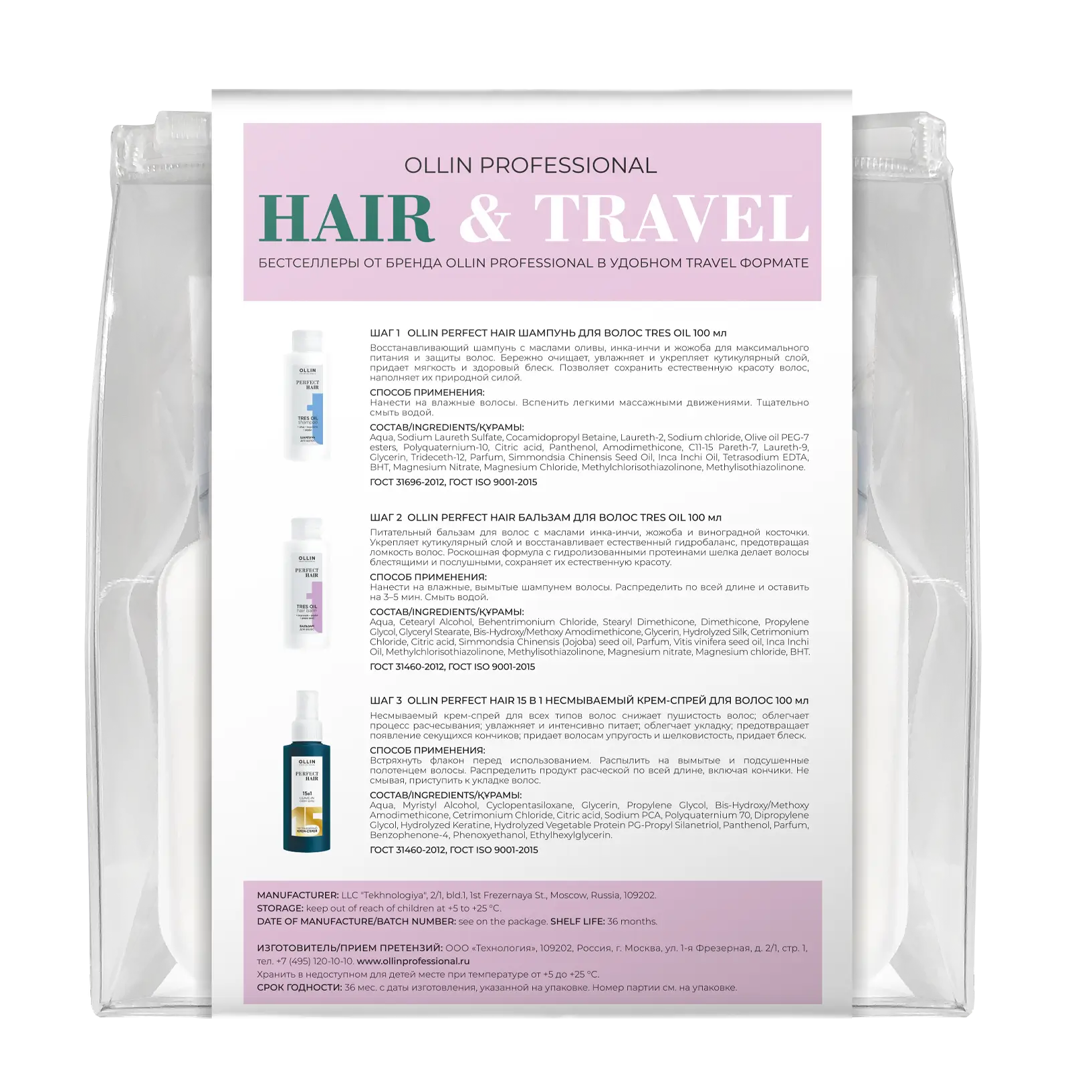 Преимущества. Компактный и легкий — помещается в любую сумку и подходит для авиаперелетов. Глубокое питание и защита волос в условиях сухого воздуха в самолете, жаркого солнца или холодного ветра. Мягкие, послушные и блестящие волосы независимо от климатической обстановки. Забудьте о сложностях ухода за волосами в поездках и наслаждайтесь комфортом вместе с набором HAIR&TRAVEL от OLLIN PROFESSIONAL!
