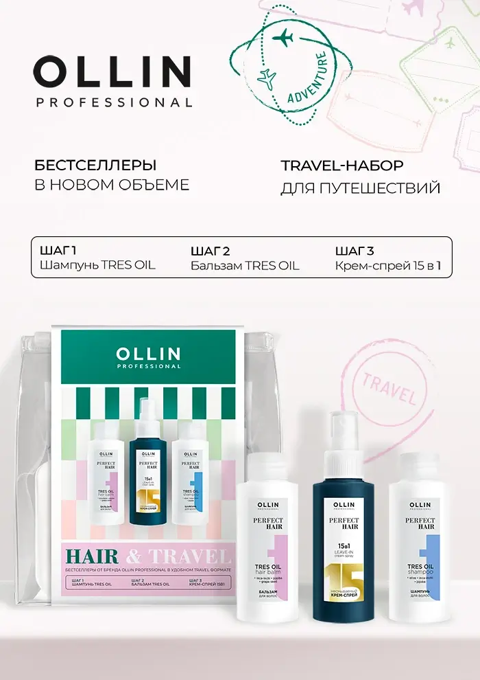Путешествуйте с комфортом вместе с набором HAIR&TRAVEL от OLLIN PROFESSIONAL! Теперь бестселлеры бренда представлены в удобных мини-форматах 100 мл, которые легко помещаются в ручную кладь и соответствуют требованиям авиаперевозок.
