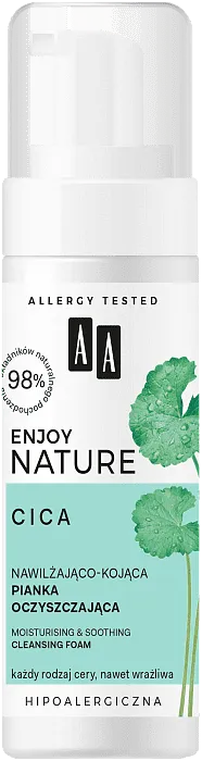 AA Enjoy Nature Cica пенка успокаивает и восстанавливает кожу, делая ее мягкой и гладкой. Протестирована на людях с аллергическими кожными заболеваниями. Не содержит красителей, с гипоаллергенным парфюмерным составом. pH нейтральный для кожи. Подходит для любого типа кожи, даже чувствительной. 98% ингредиентов натурального происхождения.