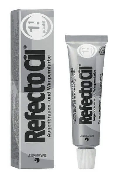 RefectoCil No. 1.1 graphite (графит) – идеально подходит для бровей с проседью. Эта краска деликатно и равномерно окрашивает седые или светлые волосы в цвет от светло-серого до темно-серого в зависимости от времени экспозиции краски.