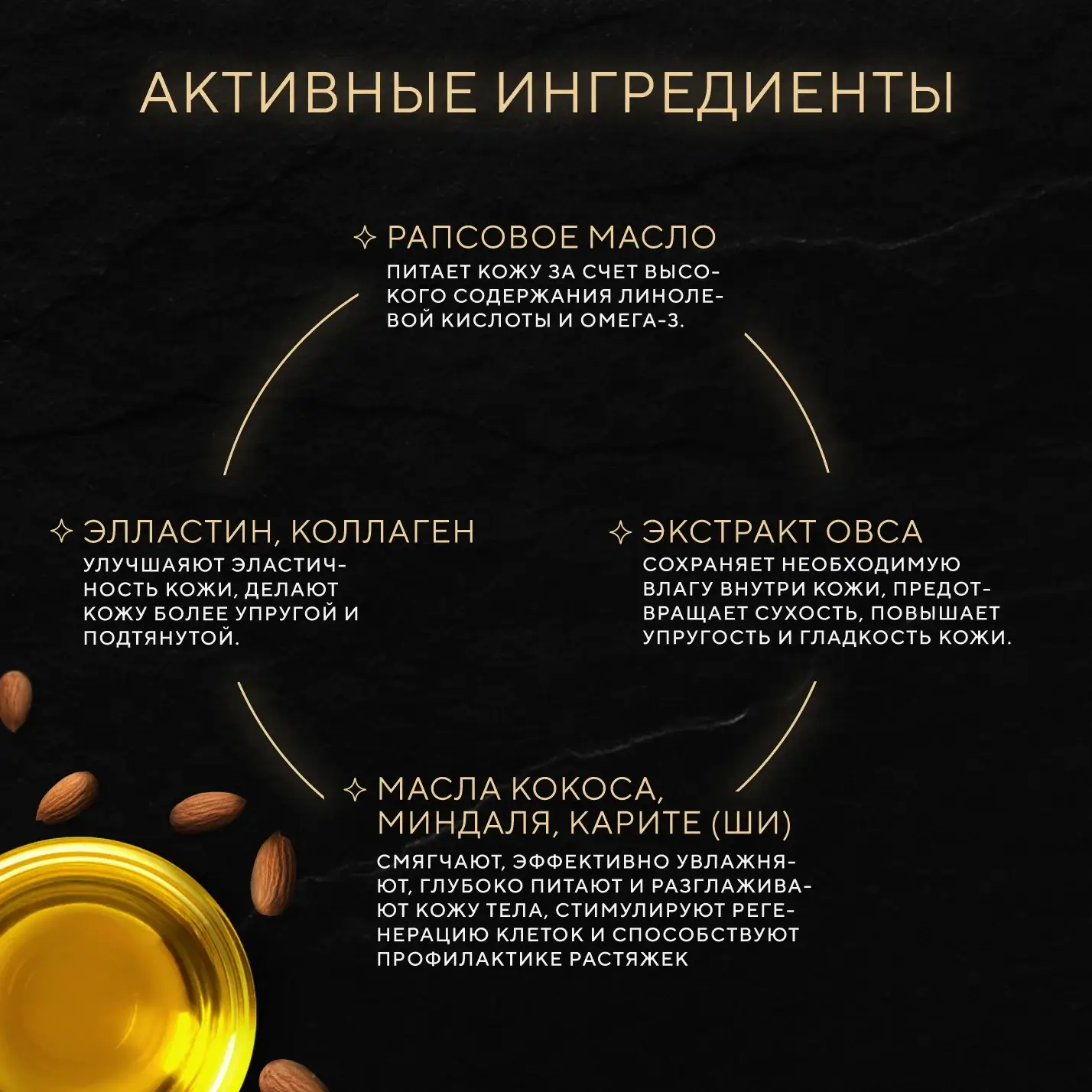 Aqua, Brassica napus seed oil, Prunus Amygdalus Dulcis (Sweet Almond) Oil, Butyrospermum Parkii (Shea) Butter, Cocos nucifera (coconut) oil, Glycerin, Glyceryl Monostearate, Ceteareth-20, Phenoxyethanol, Methylparaben, Ethylparaben, Propylparaben, Propylene Glycol, Avena Sativa (Oat) Extract, Polyquaternium-7, Allantoin, Carbomer, Sodium Hydroxide, Mangifera indica (mango) seed butter, Hydrolyzed Collagen, Hydrolyzed Elastin, Disodium EDTA, Parfum, CI15985, Coumarin.