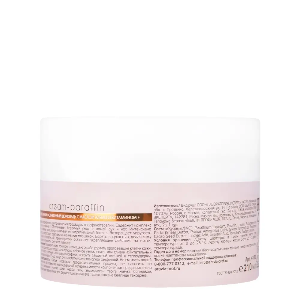 Крем-парафин предназначен для проведения процедуры парафинотерапии. Обеспечивает бережный уход за кожей рук и ног. Интенсивно увлажняет и смягчает кожу, восстанавливая ее гидролипидный баланс. Возвращает упругость и эластичность,способствует разглаживанию мелких морщинок. Комплекс из масла какао и витамина F борется с сухостью, делая кожу мягкой, гладкой и бархатистой. Крем-парафин оказывает укрепляющее действие на ногти, предотвращает их ломкость, смягчает кутикулу.