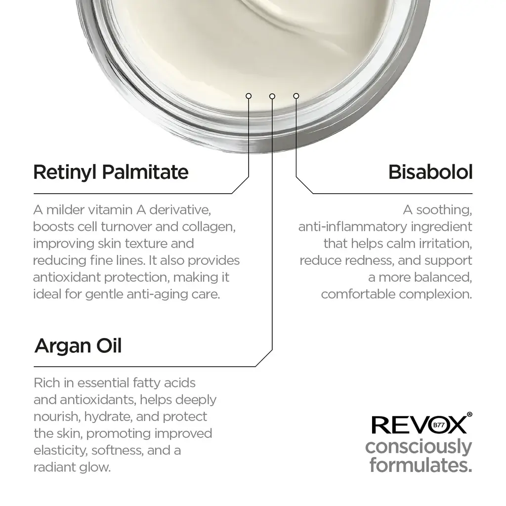 Этот крем против морщин помогает восстановить кожу и придать ей более здоровый цвет. Крем обогащен ретинолом (витамин А), витамином Е, аргановым маслом и SPF для защиты кожи от ультрафиолетового излучения. Ретинол помогает уменьшить видимость мелких морщин, преждевременное старение кожи и недостатки, вызванные воздействием солнца.