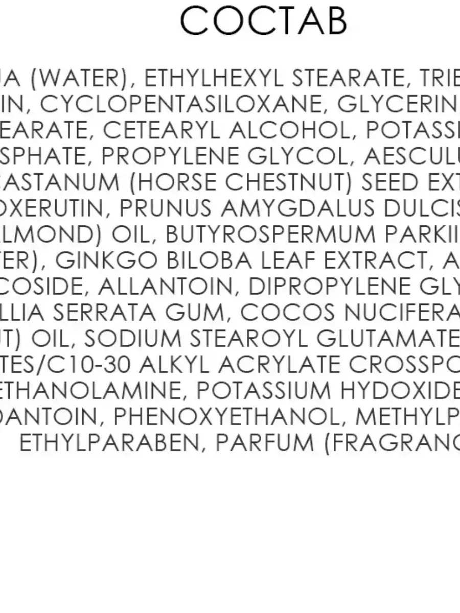 water; glycerol; dipropylene glycol; propylene glycol; allantoin; cyclopentasiloxane; flavoring; phenoxyethanol; triethanolamine; methylparaben; cetearyl alcohol; ethylparaben; ethylhexyl stearate; ginkgo biloba extract; horse chestnut oil; coconut oil; dmdm hydantoin; ascorbyl glucoside; troxerutin; sweet almond oil; sodium glutamate; glyceryl isostearate; horse chestnut fruit concentrated extract; potassium hyaluronate; Shea Butter