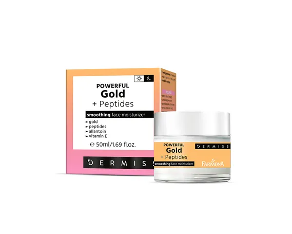 Омолаживающий крем для лица Dermiss с золотом и пептидами обладает разглаживающим и увлажняющим действием. Крем повышает упругость и эластичность кожи, оказывает омолаживающий эффект, устраняет сухость и дряблость, придает сияние коже и гладкость. Уменьшает выраженность мелких морщин и глубину крупных заломов, успокаивает, оказывает антиоксидантный эффект, предупреждая старение кожи.