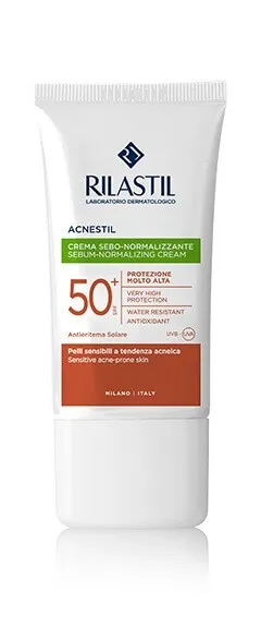Легкая эмульсия Rilastil SUN SYSTEM ACNESTIL Солнцезащитный крем SPF 50+ для кожи склонной к акне, 40 мл( Риластил солнцезащитный крем для кожи склонной к акне), обогащенная азелоглицином и ниацинамидом, с себорегулирующим и матирующим действием. Содержащиеся витамин Е и дикалий глицирризинат обладают успокаивающим действием.