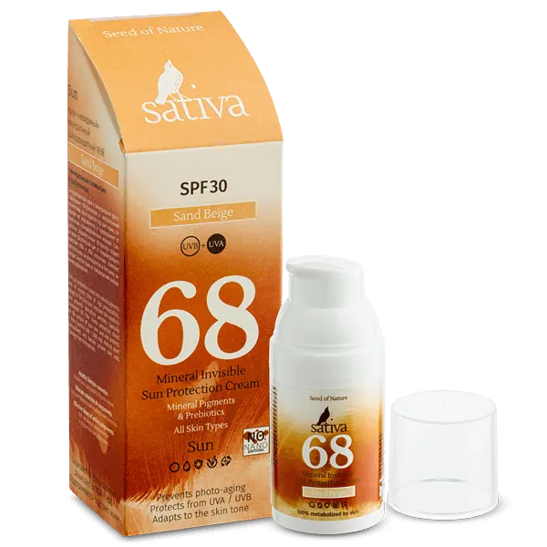 Товар Крем солнцезащитный SPF 30 от фотостарения 68 S невидимый минеральный, Крем хамелеон песочно-бежевый SUN Cream Sativa Кремы