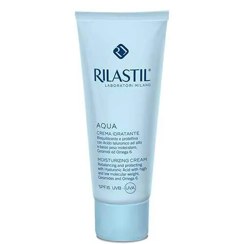 Rilastil AQUA Увлажняющий защитный крем SPF 15 (средняя защита) для лица содержит увлажняющие и защитные активные компоненты.