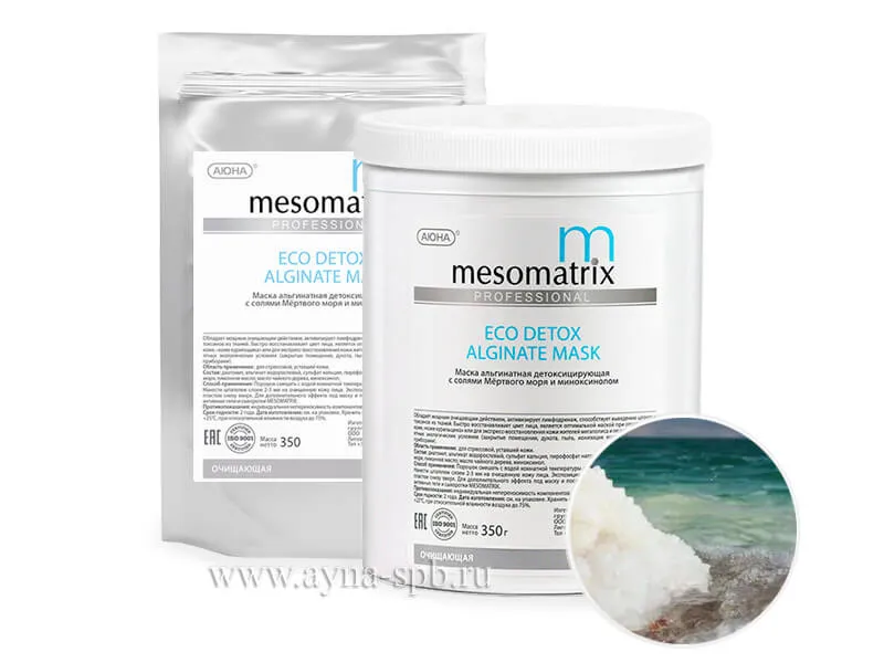Альгинатная маска обладает мощным детоксицирующим, очищающим действием, активизирует лимфодренаж, уменьшает отечность, очищает поры, способствует выведению шлаков и токсинов из тканей. Альгинат в комплексе с солевым комплексом Мёртвого моря быстро восстанавливает цвет лица. ECO DETOX является оптимальной маской при серой, тусклой коже, «коже курильщика» или для экспресс-восстановления кожи жителей мегаполиса и людей в неблагоприятных экологических условиях (закрытые помещения, духота, пыль, ионизация воздуха электронными приборами).