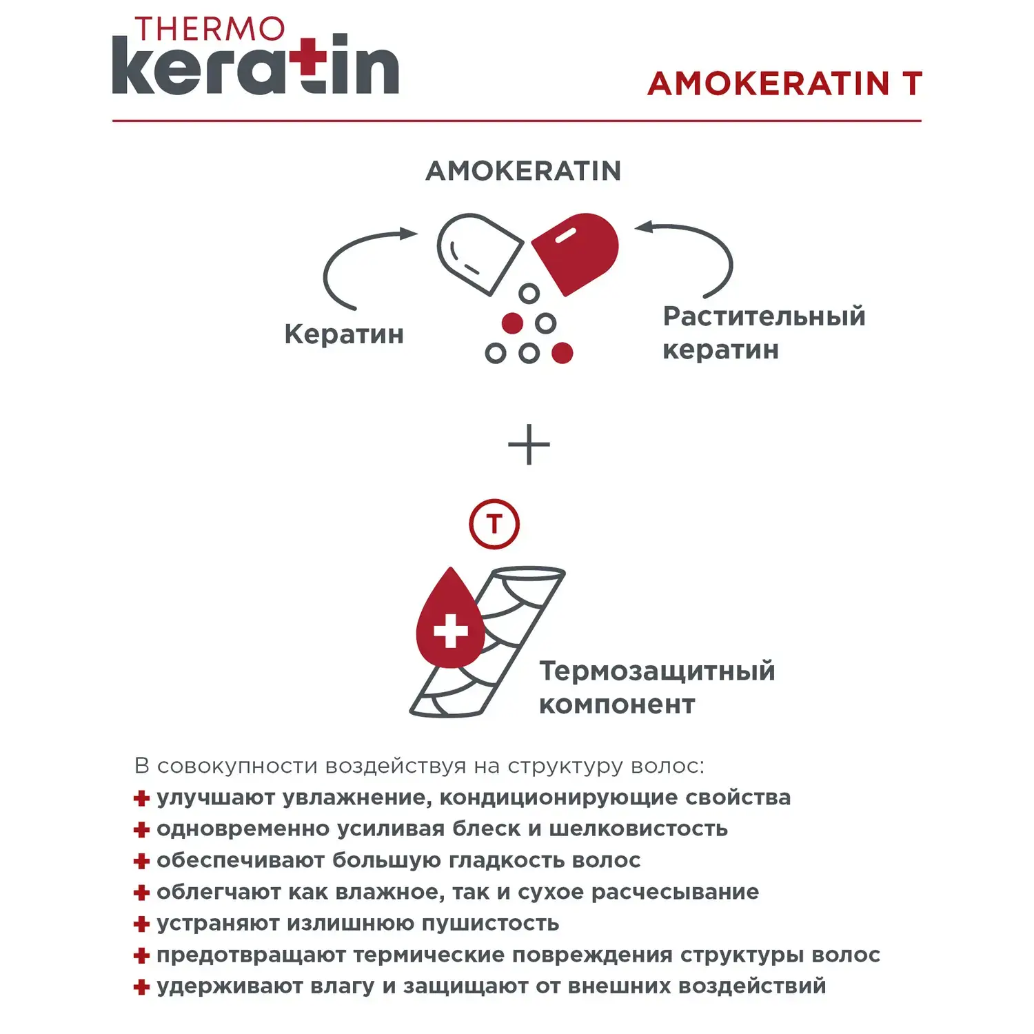 Под воздействием тепла комплекс с кератином глубоко проникает в волокно волос, обеспечивая интенсивную регенерацию изнутри. В результате восстанавливаются межклеточные связи в структуре волос, волосы насыщаются кератином, разглаживаются.
