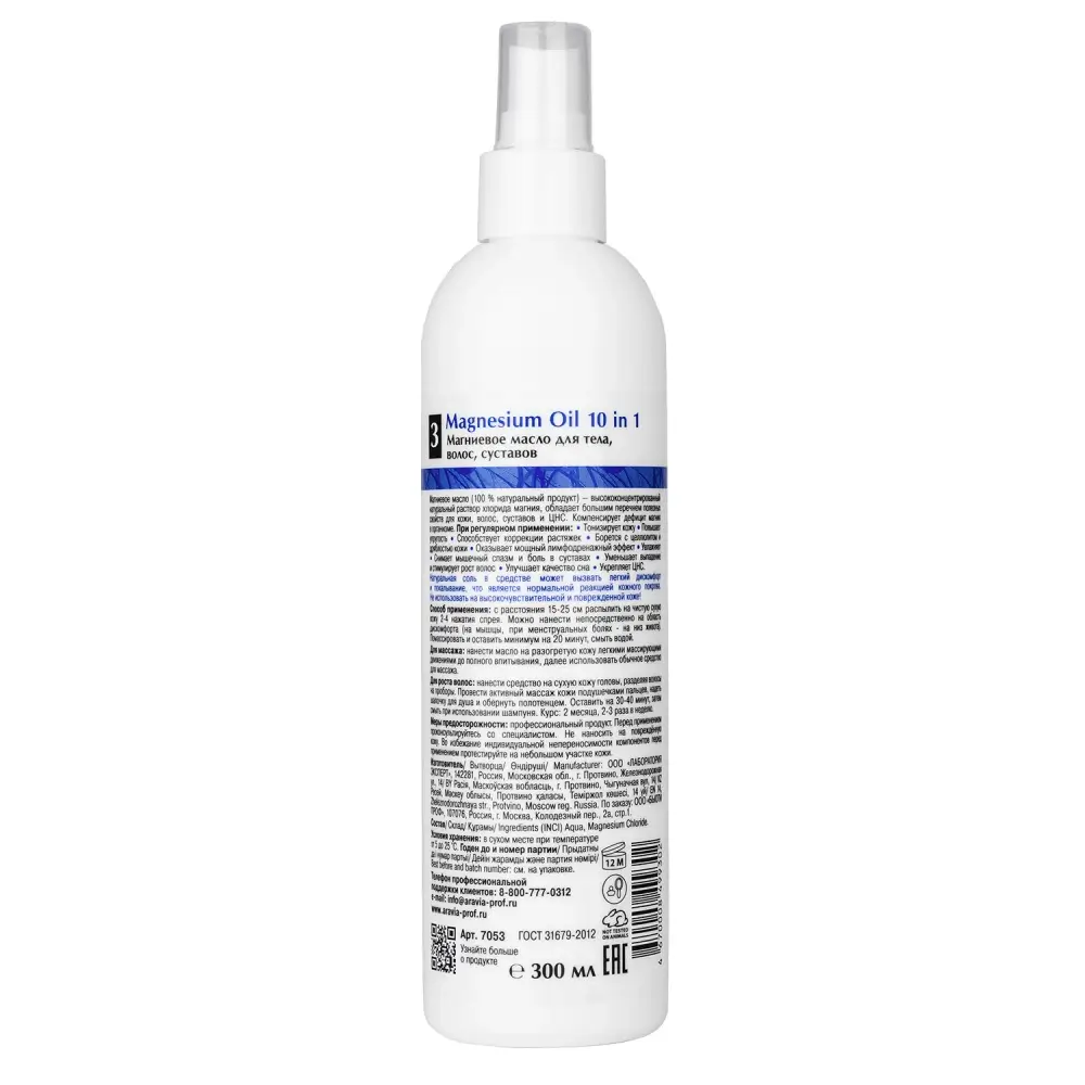 Магниевое масло (100 % натуральный продукт) — высококонцентрированный натуральный раствор хлорида магния, обладает большим перечнем полезных свойств для кожи, волос, суставов и ЦНС. Компенсирует дефицит магния в организме.
