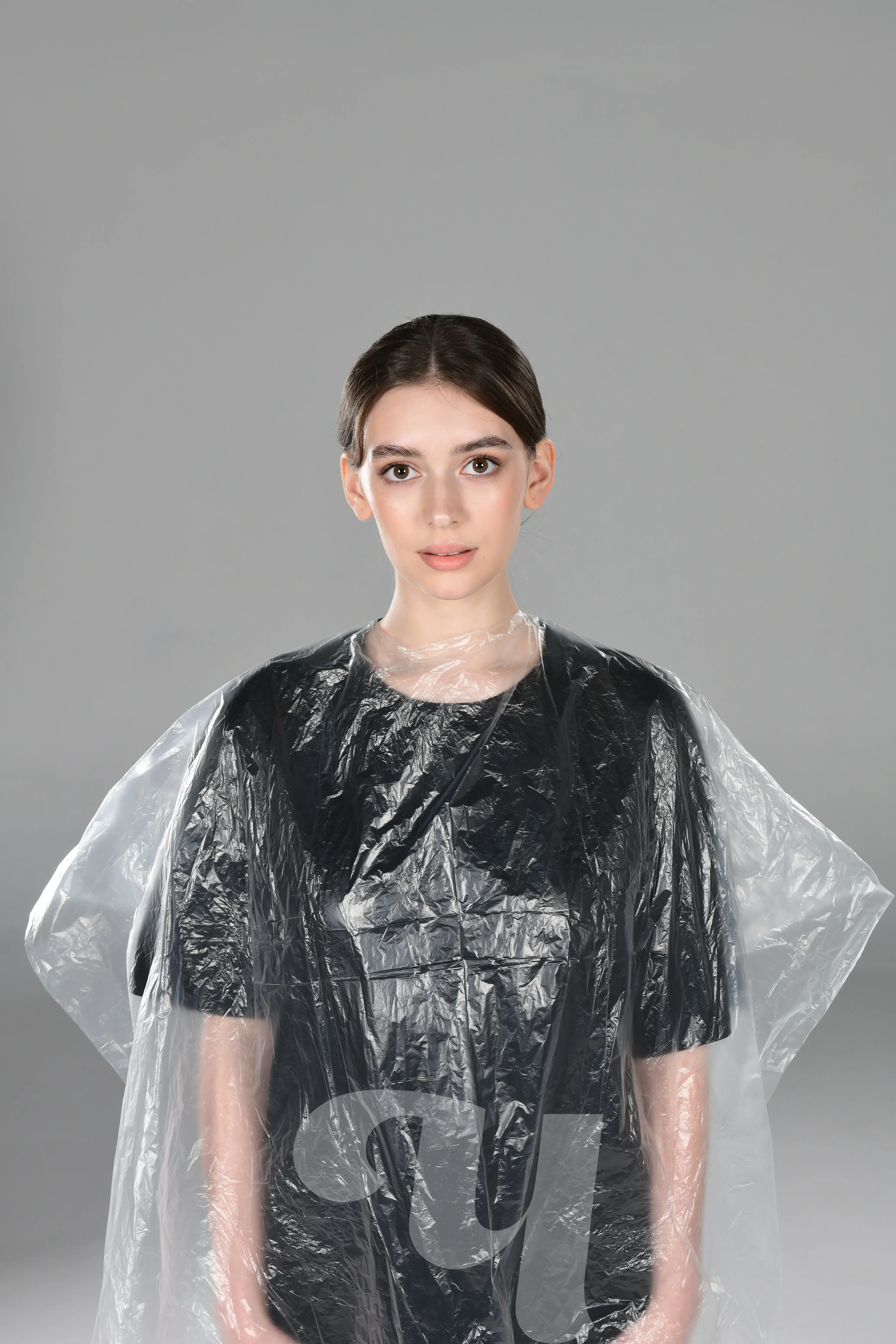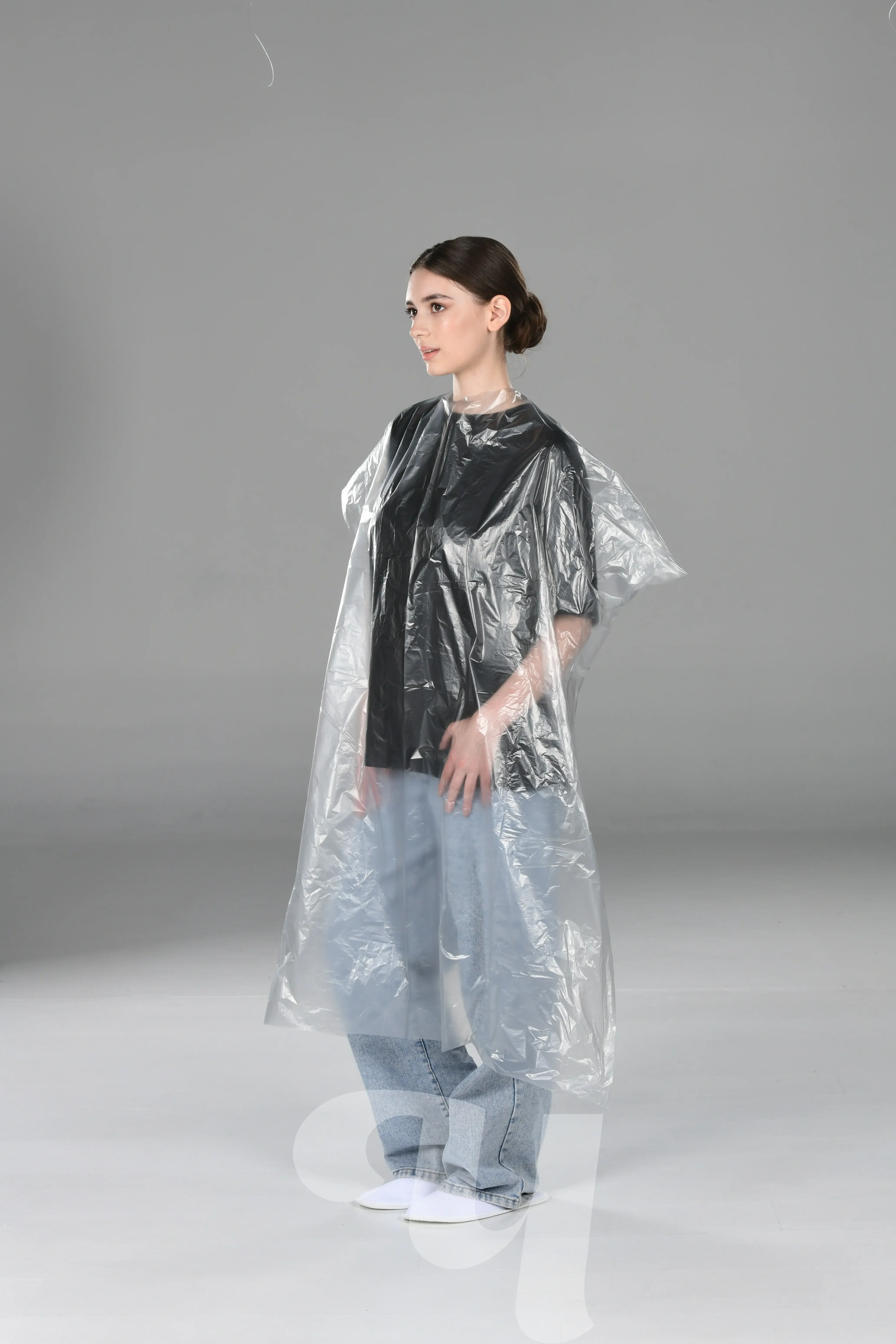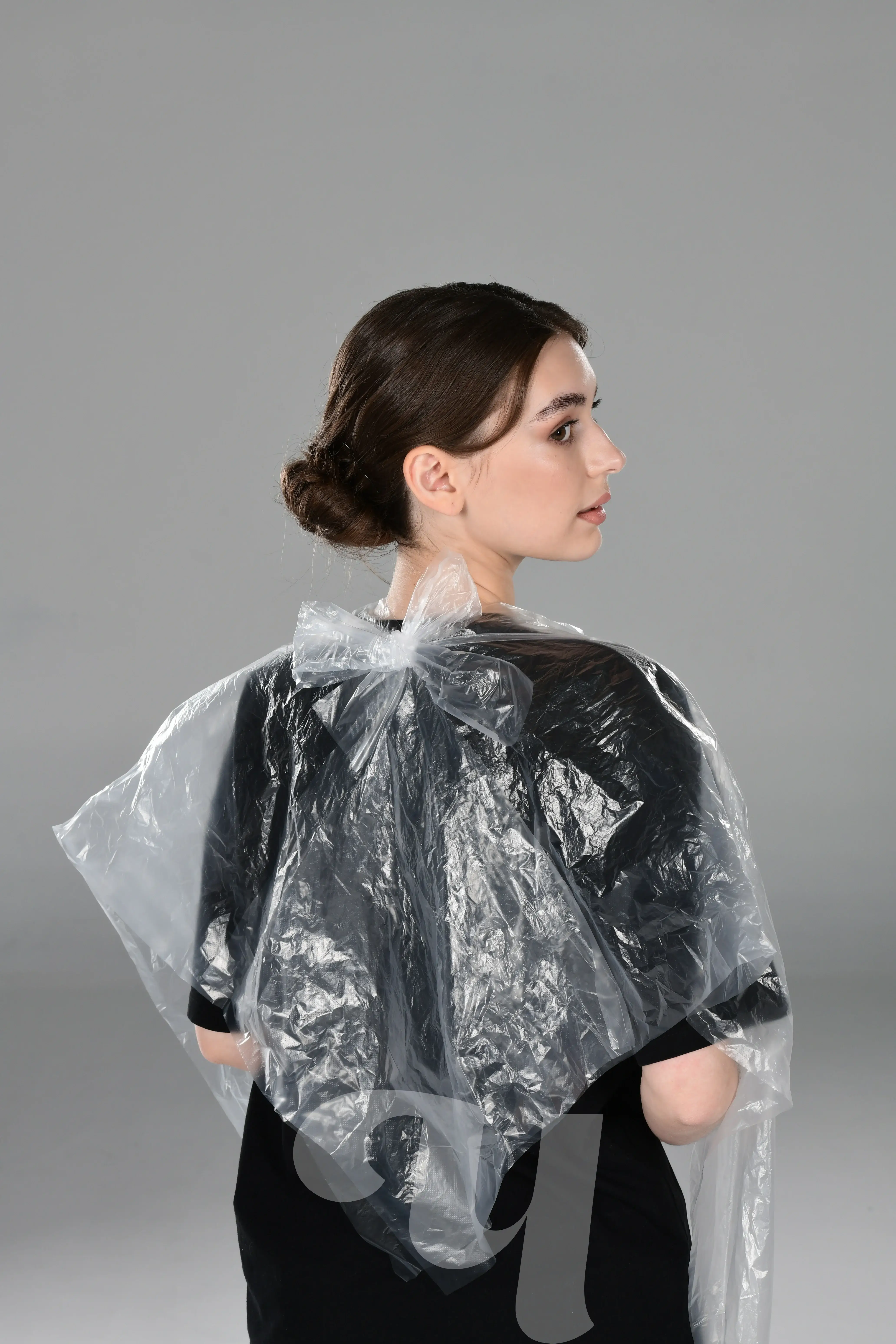 Одноразовые пеньюары из полиэтилена препятствуют попаданию воды, краски, лаков или других косметических веществ на одежду клиентов. Используются во время стрижек, окрашивания или химической завивки волос. Пеньюары стандарт относятся к базовому бюджетному варианту.