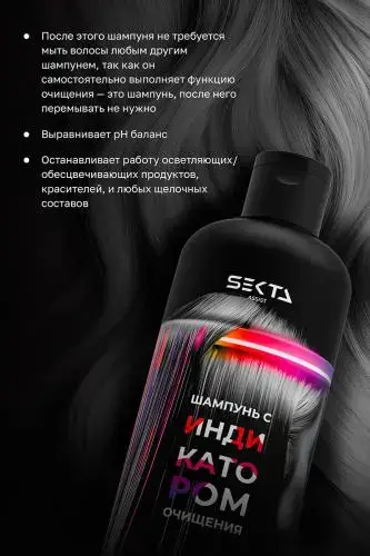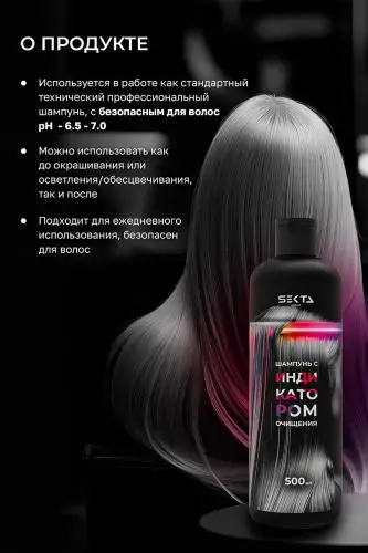 Шампунь с индикатором очищения меняет цвет при контакте с осветляющими, обесцвечивающими средствами, красителями и другими щелочными составами. Шампунь имеет оранжевый оттенок и не содержит тонирующих пигментов. Если на волосах есть остатки кислых или щелочных средств, шампунь меняет цвет на красный, розовый или фиолетовый. Оранжевый цвет шампуня не остаётся на волосах после смывания. Он не окрашивает волосы и не изменяет цвет окрашенных прядей.