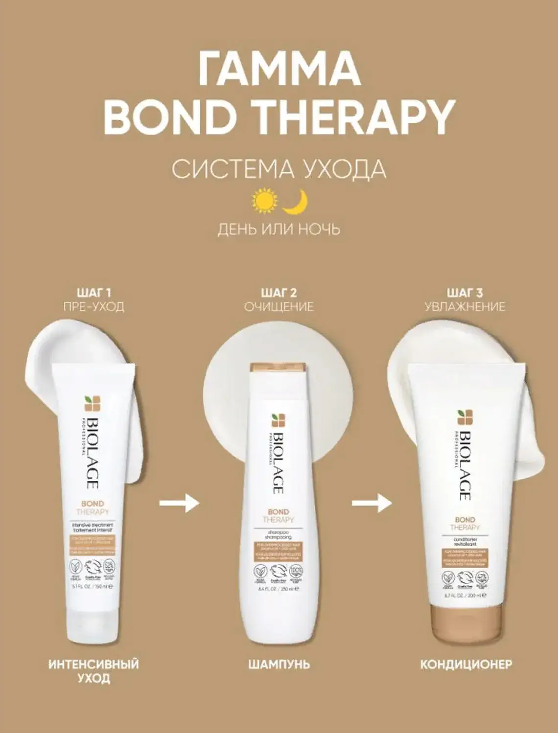 Интенсивный предварительный уход Биолаж - это первый и ключевой этап профессионального спа-ритуала Bond Therapy. Предварительный уход возвращает вашим волосам здоровое сияние, мягкость, гладкость и послушность. Комплексная процедура Bond Therapy в 4 шага укрепляет волосы, день за днем улучшая их внешний вид. Предварительный уход с научно подтвержденной эффективностью глубоко трансформирует и восстанавливает жесткие, ломкие, существенно поврежденные волосы, подверженные частым укладкам, осветлению и окрашиванию.