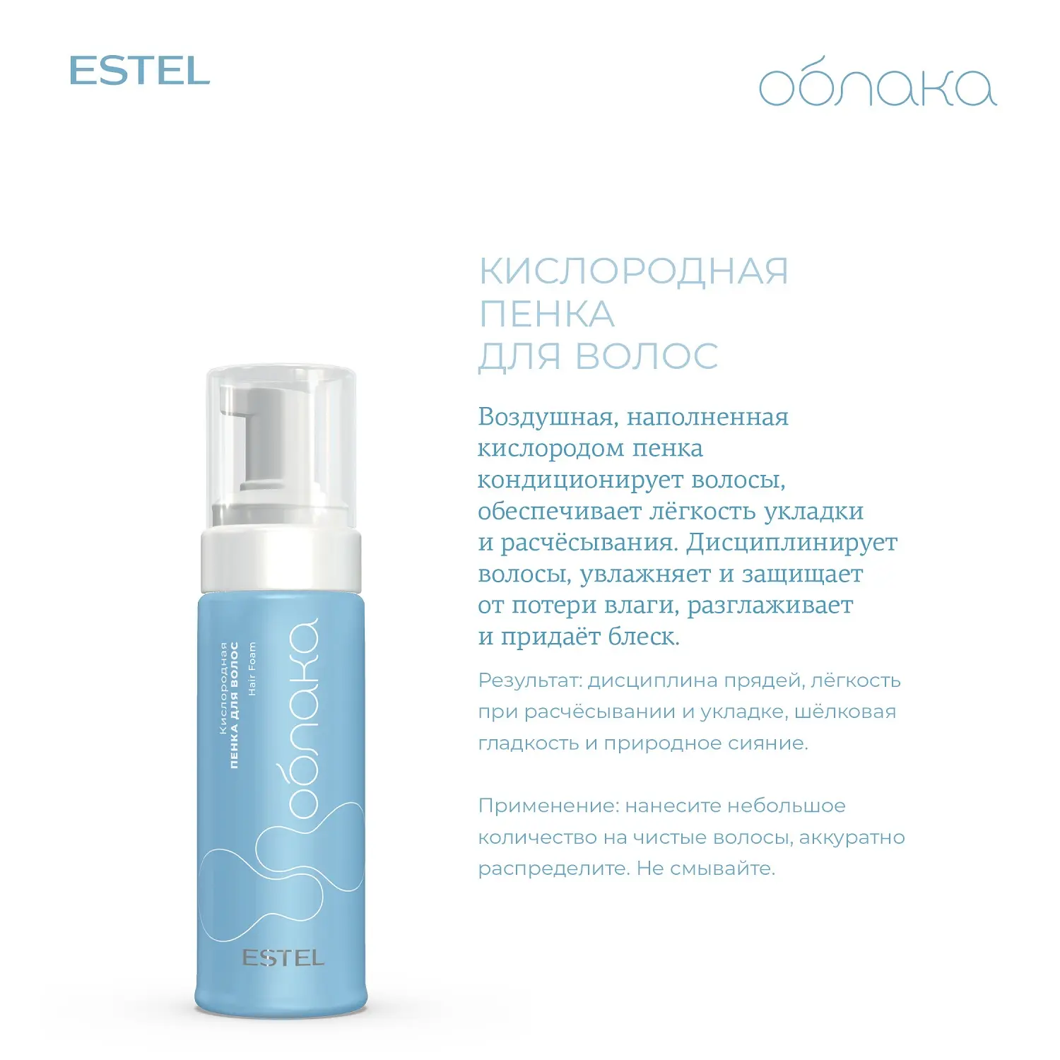 Воздушная, наполненная кислородом пенка кондиционирует волосы, обеспечивает лёгкость укладки и расчёсывания. Дисциплинирует волосы, увлажняет и защищает от потери влаги, разглаживает и придаёт блеск.