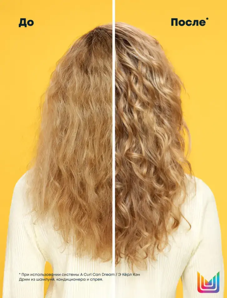 *Потребительский тест, 57 участников, при использовании невесомого увлажняющего шампуня, кондиционера и дефинирующего спрея A Curl Can Dream /Э Керл Кэн Дрим.