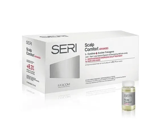Ампулы SERI Scalp Comfort для лечения выпадения волос. В состав ампул входят лечебные вещества L-цистеин Cystine и auxina tricogena. Эти вещества стимулируют кровообращение кожи головы, укрепляют и увлажняют волосы, эффективно останавливают выпадение волос, уменьшают образование секущихся кончиков волос и до 10% увеличивает объем волос.