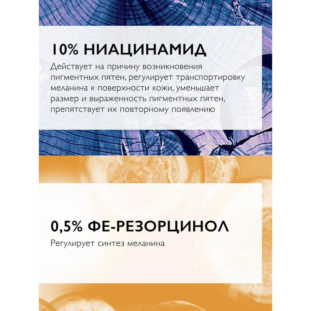 Уменьшает пигментные пятна и выравнивает тон кожи.
