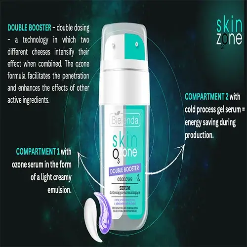 DOUBLE BOOSTER – технология двойной дозировки, закрытая в двух разных отсеках с интенсивным эффектом при объединении. Формула озона облегчает проникновение и усиливает действие других активных ингредиентов.